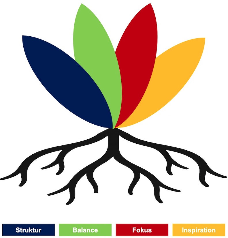 Die vier Blüten und die vier Farben sind nicht zufällig gewählt. Sie repräsentieren die vier Komponenten Struktur, Balance, Fokus und Inspiration.